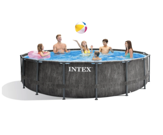 Piscina Estructural Redonda INTEX Prism Frame Greywood Premium, 457 x 122 cm, 16.805L, con Bomba, Escalera, Cobertor y Tapiz